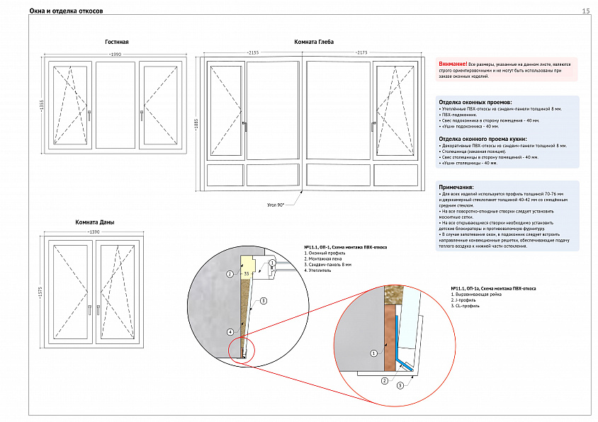 Также на этом листе мы даём рекомендации по толщине профиля и стеклопакета, а главное — даём подробные сечения по всем узлам примыкания, которые включают даже информацию о длине свеса подоконника в сторону квартиры и в сторону откосов. И когда к вам приезжает замерщик по окнам или мастер-монтажник, вы уже не тратите время на обсуждение, а просто отдаёте ему эту схему.