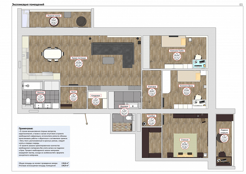 Также на этом листе мы указываем площади стен и пола по каждому помещению, включая вспомогательные, чтобы мастера точно понимали масштабы и могли заранее оценить объём работ. Это застрахует вас от внезапного изменения стоимости их услуг.